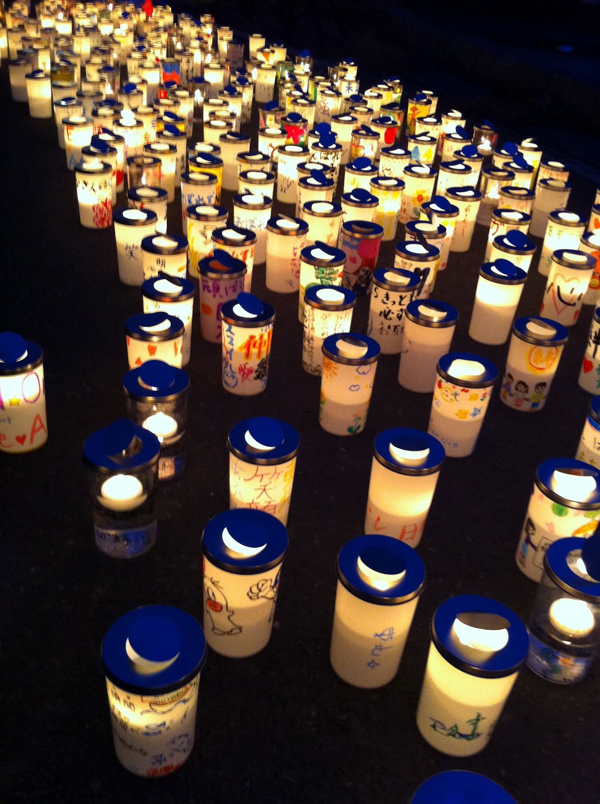 Below: Candles, before and after dusk, with messages received from residents of Yokohama City for the 3.11 remembrance ceremony