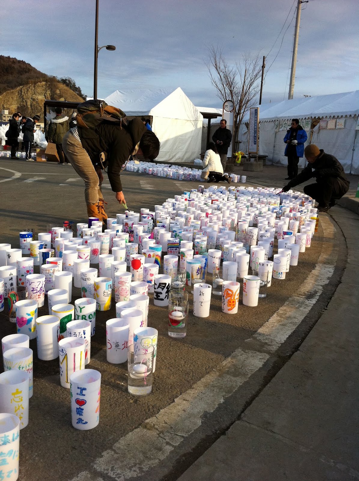 We made our way back to the shop after the ceremony to pick up our things, passing by several makeshift altars along the way that had been set out along the streets with candles and small canes of bamboo. A Buddhist monk was sitting in front of one of them lighting incense and chanting, presumably to comfort the souls of the dead. After being invited to pray, I joined others in pinching a fingerful of incense and bringing it to my forehead three times in succession, trying to send deep comfort to the souls of both the departed and the loved ones they had left behind. (Kanagawa-based blogger Ruthie Iida explores related topics in her deeply poignant essay “Tsunami Damage: Living with Ghosts and Spirits”).